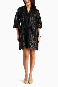 A mini dress with a relaxed, belted silhouette featuring intricate laser-cut eyelet lace over a contrasting lining. Its mandarin-style neckline, hidden placket, and voluminous three-quarter sleeves add elegance, while the detachable tie-belt creates a flattering, feminine shape.
