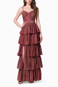 The Lydia Long Dress is a true showstopper, designed for those who want to make a statement. Featuring a sweetheart neckline and sleeveless design, this dress blends modern elegance with sophisticated charm. The pleated bust, boned bodice, and built-in chest pads create a flattering fit, while the tiered skirt and side slit add a dramatic touch. A criss-cross tie-up at the back and an invisible zip closure at the skirt complete the look. Fully lined for comfort, this dress is perfect for cocktail parties and night events.