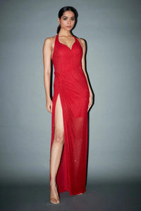 Featuring the Lydia Red Dress by ITRH's Diwali Jaaneman Collection, this red halter gown is crystal-embellished with a stunning side open slit, offering a perfect balance of allure and elegance for an unforgettable festive look.