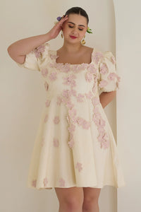 Featuring a fit-and-flare silhouette, the Lilac Floral Appliqué Dress has a rectangle neck and puffed half sleeves. This short dress is adorned with delicate organza flower patches all over, creating a charming and elegant look perfect for any occasion.