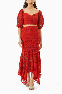 Red Floral off shoulder blouson top with fishcut handerchief skirt Coord Set
