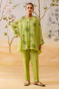 The Maanvi Co-Ord Set features a green mul chanderi gathered top, beautifully adorned with thread and hand embroidery for a touch of elegance. Paired with a short cotton slip and cotton silk pants, this set offers a chic, comfortable look that blends traditional craftsmanship with modern style.