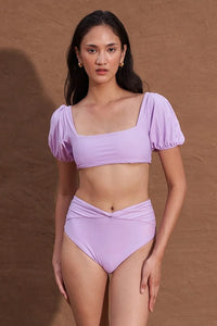 Introducing the Macan Top, designed in luxurious Italian fabric for sculpting comfort. Featuring a squared neckline and stylish balloon sleeves that adjust at the arm, this top offers a unique silhouette that stands out. Paired with our coordinating Bikini Bottom, also crafted from premium Italian fabric, this set includes a twist front and high waist design for full coverage.