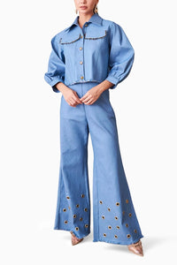 The perfect balance of casual and chic, this light blue denim cropped jacket and flared pants set with gold buttons and frayed edges is winter fashion at its best.