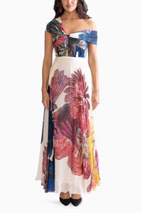 Featuring Madeline Multi Dress by Saaksha & Kinni from Botanica Collection. A daisy print tiered effect dress showcasing a draped overlap and off-shoulder sleeves, blending floral charm with elegant layers for a chic and romantic look.