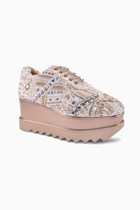 Our Mademoiselle wedge sneakers embody this spirit in their sharp geometric patterns, refined hand embroidery, and shimmering embellishments. The design showcases mirror and thread work, brought to life with pearls and sequins in ivory, beige, and gold tones.