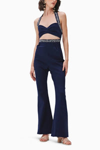 The Magarita Dark Wash Denim Jumpsuit features a sleek dark wash denim fabric with a halter neck design and a flattering waist cutout. This stylish and modern jumpsuit combines edgy charm with a flattering silhouette, perfect for casual or semi-formal events.