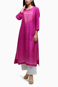 This is a Bandhani on silk kurta with magenta base and rani circle yoke. The yoke comes highlighted with hand done gota patti work