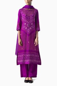 This magenta silk kurta is a traditional Aba Bandhani design. It is highlighted with hand done gota patti motifs. It comes clubbed with organza stole and silk pants.