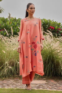 The Magnolia Applique Co-ord Set features delicate contrasting floral applique and thread embroidery on the kurta and sleeves. Its flowy, asymmetrical silhouette is paired with matching pants accented by striped detailing, creating a graceful and effortless festive look.