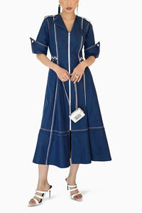 This denim Magnolia midi dress features intricate hand embroidery on the side belt and a front-open zipper with button detailing. With elbow sleeves and statement cuffs, it is accented by multi-color stitch lines, white piping, and functional pockets. Designed for a comfort fit, it offers both style and ease.