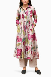 Featuring a Magnolia shirt kurta set in a neutral cloudy gray color invokes a vision of comfort and sophistication. The button-down collared tunic has pleat details on the front and back and has raglan sleeves with beautifully handcrafted buttons and mesmerizing foliage print. This effortless tunic is paired with a floral print straight chanderi pants and is the comfort wear go-to set from Taro library.