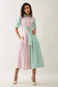 Featuring the Orchid and Sea Green Splits Print, the Magnum Dress captivates with its A-line silhouette and collar. Short sleeves with elastic detailing offer a relaxed fit, while the contrasting belt showcases the print horizontally, adding style and interest. This dress perfectly balances bold prints with thoughtful details for a standout look.