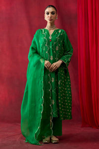 Featuring a green block-printed silk Chanderi kurta with side kali gathers, beautifully enhanced with thread and hand embroidery. Paired with an embroidered green silk organza dupatta and complemented by cotton silk pants, this ensemble combines artisanal detail with timeless elegance.