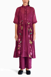 Featuring an effortless ensemble for your everyday wear, this collared shirt kurta in wine red color is tailored in chanderi silk. It’s fitted at the waist and flared at the bottom, and comes with side pockets. The kurta is adorned with beautifully handcrafted beaded buttons. A companion for days and evenings, this kurta comes with elegant floral-printed chanderi pants to complete the look.