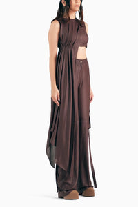 The Mahogany Leather Chiffon Draped Top, crafted from luxurious leather chiffon in rich brown, features elegant draping for a fluid, sophisticated silhouette. This unique top combines the opulence of leather with the delicate flow of chiffon, offering a bold yet refined statement piece.