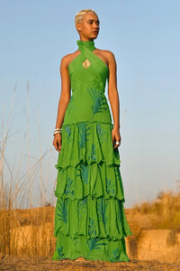 Grand and green, the Makeba Dress is unique and unforgettable. It features extensive hand-embroidery, and its halter top adds a beautiful element to the garments flattering silhouette.