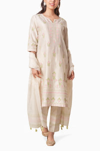 This elegant outfit features a applique embroidered ivory kurta, showcasing soft pastel tones of pink and green in a charming geometric and floral pattern. The kurta's neckline and borders are intricately detailed, enhancing its sophisticated appeal. The 3/4 sleeves add a touch of timeless grace to the overall design. Paired with straight pants, adorned with matching embroidery and subtle pleats at the hem, this ensemble exudes understated elegance. Completing the look is a coordinating ivory dupatta, finished with playful tassels and delicate thread work, making this outfit perfect for any elegant occasion.