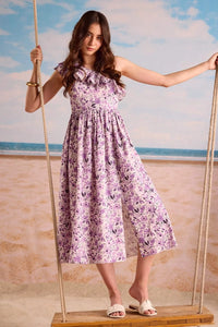 Embrace effortless elegance with this charming one-shoulder floral Málaga Midi Dress, featuring soft lilac hues and delicate ruffle detailing. The lightweight fabric and flowy silhouette make it the perfect choice for a breezy day out, radiating femininity and grace. Pair it with nude sandals and dainty gold accessories for a fresh look.