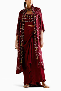 Featuring Malini Maroon Bandhini Jacket with Blouse and Skirt by 5 Elements by Radhika Gupta from Mitti Collection. This handcrafted bandhini overlay jacket showcases peacock detailing with ghungroos and bead tassels. It pairs with an embellished inner top accentuating the same peacock theme. The draped bottom has an elasticated waist for a comfortable fit.