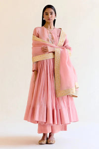 The Mallika Anarkali, crafted in buttery soft Chanderi with a breathtaking 15-metre ghera, features a handwoven Mughal tulip motif highlighted with zardozi embroidery on the yoke and sleeves. Paired with wide silk pants and the flowing Mallika Odhni in pure silk organza with a rich handwoven heritage border.
