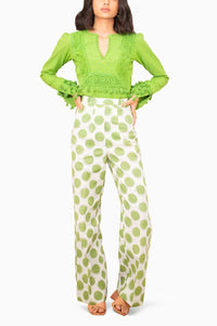 Featuring the Malta Green Lace Co-ord Set by Kalakaari by Sagarika Singhvi a chic cotton lace blouse in soothing green, paired with high-waisted polka dot pants. This handblock printed set blends grace and comfort for elevated everyday wear.
