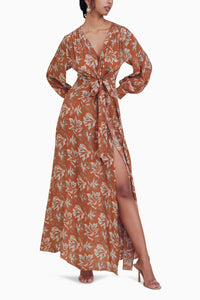 The Sahara dress is delicately crafted with luxurious, natural fabric and accentuated with a flowy silhouette. This dress features an open kimono style tie-up closure, pleating on the shoulders, and voluminous cuffed sleeves for an opulent and relaxed fit.