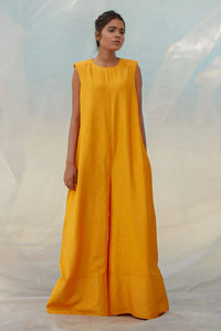 Flared sleeveless jumpsuit in a gorgeous yellow. The jumpsuit has pockets and shoulder pads.