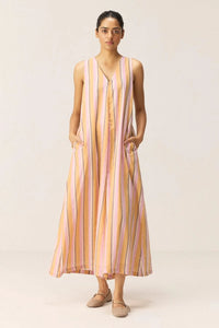 Featuring a timeless Khara Kapas silhouette, this jumpsuit is crafted in pure cotton mul and adorned with vibrant pink, orange, and white stripes that add a fresh, playful touch. Designed with a flattering V neckline, practical pockets, and a front zipper, it’s fully lined for all-day comfort, effortlessly balancing classic charm with everyday ease.