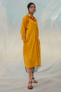 Shirt dress with mango yellow front and printed back. Our statement windowleaf print on black base, has pockets.