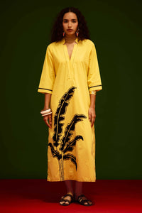 Featuring a mango yellow cotton thread embroidered dress with elegant leaf motifs, this relaxed-fit design is made from breathable cotton poplin, combining vibrant charm with everyday comfort.