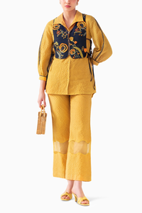 Transform your wardrobe with the Porto Navy Bubble Crepe Embroidered Half Jacket, paired with a Mangobay Ochre Nylon and Cotton Dobby Shirt and Pants. The half jacket features stylish side tie knots, contrast stitch line details, and a front zipper for a modern touch. Underneath, the comfort-fit ochre shirt boasts fabric buttons and twill tape detailing on the sleeves, with a soft lining for added comfort. The coordinating straight pants are adorned with organza wave appliques, featuring a side zipper and back elasticated waistband for a perfect fit. This ensemble effortlessly blends sophistication and style for any occasion.
