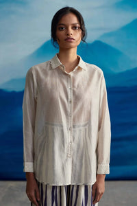 Presenting the timeless shirt, boasting a laid-back fit, meticulously tailored in exquisite chanderi fabric. The airy texture provides a subtle counterpoint to the traditional silhouette. Subdued intricacies grace the shirt, featuring laces on the collar, cuffs, and yoke. Infinitely adaptable, it effortlessly complements trousers, denim, or even a skirt.