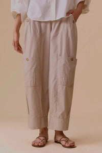 High-waisted cargo pants made from 100% cotton poplin, featuring functional pockets and stylish horn buttons on the pockets. Perfect for a comfortable, trendy look.