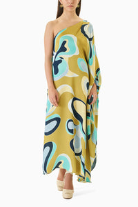 The maple one shoulder dress crafted from our stunning vegan silk fabrication is a versatile piece. Made in our abstract maximalist maple print. This is a trend setting piece featuring a one shoulder and kimono sleeves on the other side. This piece is stylish and easy to wear. It is full length and has a zipper on the side. Pair it with heels for an elegant look.