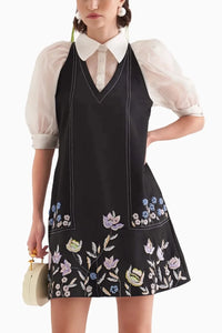 This banana crepe A-line embroidered dress features an elegant organza layer on the yoke and sleeves. With an above-knee length, side pockets, and stitch line details, it combines stylish design with functionality for a chic and comfortable look.
