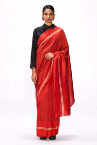 Handwoven sillk striped saree with a shibori border detailed with hand embroidered gota and a delicate cluster of beads. It comes with an unstitched rust silk blouse piece.
