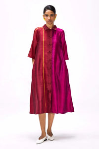 A button-down handwoven silk striped dress featuring shibori. With a relaxed fit, a collared neckline, and side pockets, it works well both as a dress or as a layer. The dress is lined and has a flattering fall.