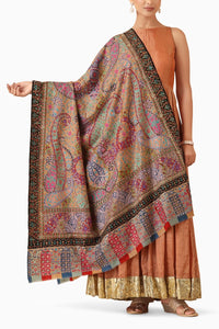 Unwrap a tale of tradition with the Margot Pashmina Shawl. Handwoven from the finest pashmina wool, it features exquisite Kalamkari Adda work, where silk thread narrates vibrant stories on the soft canvas.