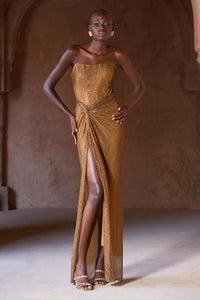 Crystal-embellished gold gown with an attached corset, ruched bottom, and a front slit on the right leg.