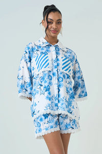 Crafted in breathable rayon slub with a fresh white-and-blue print, this co-ord set blends ease with elegance. Delicate lace detailing on the pockets, sleeves, and hemline adds a soft, feminine touch. The set is perfect for days when you want comfort without compromising on style.