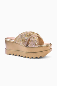 Our Marigold wedge sandals are crafted from luxurious satin and adorned with intricate Indian embroideries, including cutdana and zardozi work. The crossover straps feature sculpted florals, inspired by the blooms that grace every Indian celebration. Each flower on the straps is surrounded by gold sequins, threadwork, and beads, creating a tapestry of opulence and festive charm.