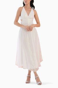 Marilyn Monroe is a classy halter neck dress inspired by famous Marilyn Monroe Moment. The Dress has a beautiful halter V neck tied at neck and a flirty cut out flattering the waist. The georgette is cut in high low pattern and attached to skirt yoke.