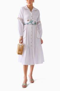 The Marina white cotton satin dress features a hand-embroidered belt adorned with coral and fish motifs for a unique touch. With contrast orange piping and stitch line details, this button-down dress includes side pockets and statement sleeves with scallop detailing. Designed with a relaxed fit, it combines elegance and comfort effortlessly.