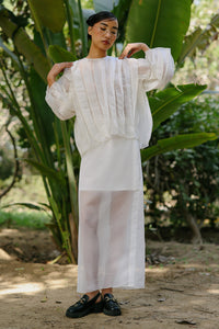Featuring the Maris Pleated Flow Co-ord Set by Trisara's Fuss Over Me Collection. This cream organza set features a pleated top with straight ruffle detailing and a sheer midi skirt, offering a loose fit for a graceful, airy silhouette.