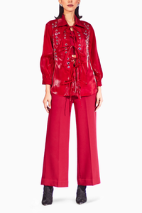 The 3-piece set is a stunning ensemble that exudes elegance. The oversized shirt in organza features tie detailing and rivets, adding a touch of glamour and style to the outfit. Inside, the bustier complements the overall look beautifully. Paired with the wide-leg pants, this set creates a chic and fashion-forward silhouette that is perfect for special occasions or events.