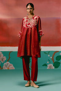 Distinctive and opulent, the Maroon Embroidered Anarkali Set features a velvet yoke with intricate gotta patti embroidery, handmade tassels, and beaded coin details. Crafted on a maroon tissue base, it’s paired with comfortable elasticated salwar pants—blending festive elegance with artisanal charm.