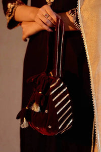 Featuring the Maroon Embroidered Potli Bag, this velvet accessory brings a touch of elegance to your festive outfits. Adorned with delicate floral embroidery and gota embellishments, it enhances your look with sophistication. The lightweight handle, crafted with gota detailing, adds beauty to the design, while velvet gota-embellished tassels complete the charm.