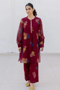 A handblock-printed relaxed-fit Maroon Co-ord Set in handwoven chanderi, featuring exquisite sequin and zari hand embroidery on the kurta placket. Crafted using natural-dyed hand block prints, the set is paired with cotton trousers, also detailed with hand block prints in natural dyes, for a refined and coordinated look.
