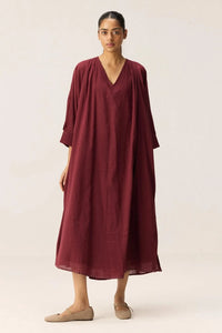 Featuring an oversized silhouette in rich maroon, this dress is crafted from soft cotton mul and enhanced with pleat detailing at the shoulders for added structure and volume. Delicate white running stitches along the hem add subtle charm, while side seam pockets offer everyday ease. Fully lined for comfort and coverage.